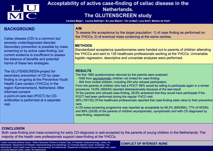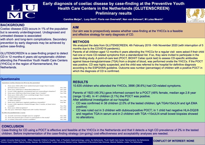 Abstract presented by Jan Heijdra Suasnabar at the ESPGHAN Annual Meeting in Vienna 19th May LONG-TERM COST-EFFECTIVENESS OF ACTIVE CASE-FINDING FOR COELIAC DISEASE IN CHILDREN IN THE (ESPGHAN AM_Vienna_19-05-2023) (002) Posters over de studie gepresenteerd door Caroline Meijer tijdens WCPGHAN 2021 Acceptability of active case finding of celiac disease in the Netherlands. The GLUTENSCREEN study Early diagnosis of coeliac disease by case finding at the Preventive Youth Health Care Centers in the Netherlands (GLUTENSCREEN) Preliminary results Statistical Analysis Plan (SAP) Statistical Analysis Plan 11-5-2021_def